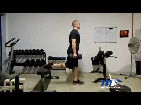 Este ejercicio puede parecer un poco extraño, pero ciertamente vale la pena. Simplemente tome una silla y apoye la parte superior de su pie izquierdo sobre ella. Ponga su pierna derecha enfrente de usted en una longitud embestida. Luego, baje el cuerpo en posición de embestida hasta que la rodilla izquierda casi toque el piso y la rodilla derecha esté paralela al suelo. Usted puede elegir usar mancuernas si se siente cómodo, pero no tiene que hacerlo.